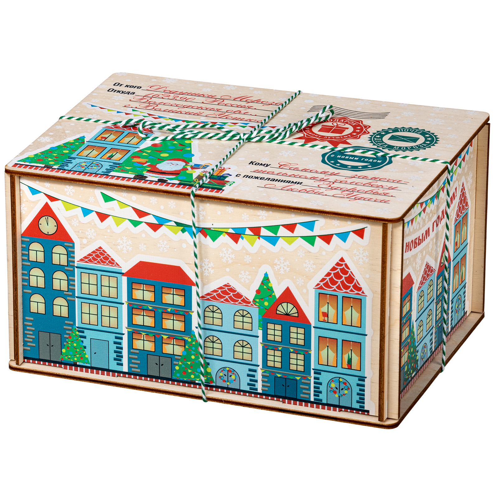 Прекрасный подарок с почтовой символикой – «Новогодний городок». Это деревянная коробочка размером 21*11*14. В которой находится кондитерский набор весом 1000 граммов. Только самые свежие и вкусные кондитерские изделия: шоколадные конфеты, печенье, десерты, вафли и многое другое. На подарке изображен новогодний городок, который украшен нарядными ёлками, разноцветными флажками и гирляндами. Подарок перевязан веревочкой, которая обеспечивает сохранность подарка. В дальнейшем эту удивительную коробочку можно использовать для хранения разных мелочей.